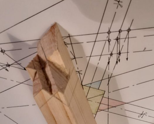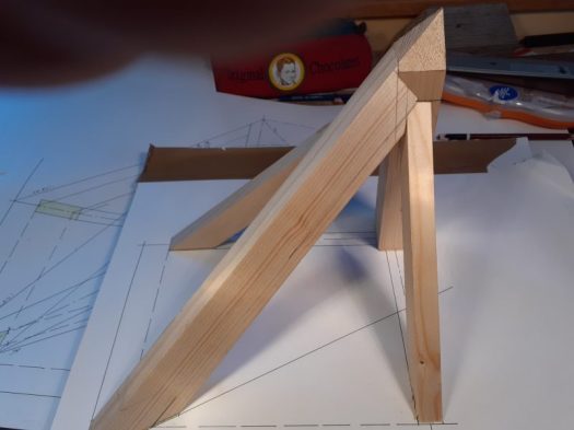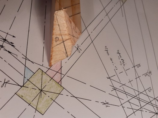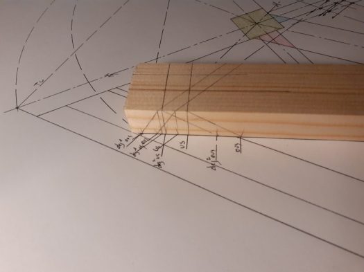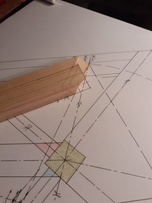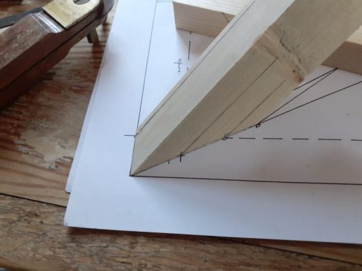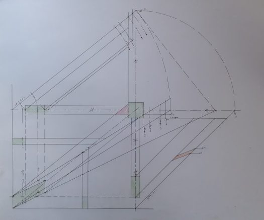 Comme vous pouvez le constater, il suffit de doubler les traits pour le déjoutement contre les faces d’arbalétriers et de laisser filer les chambrées de chevron jusqu’à la trace au sol du pied d’arêtier. Il suffira ensuite d’aligner comme de coutume avec rigueur et méthode.