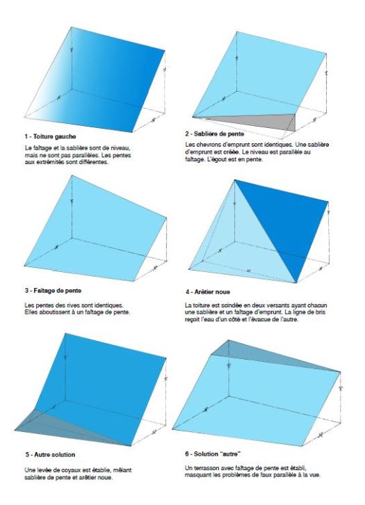 Il est bien entendu impossible d’être exhaustif. Aussi avons nous privilégié des exemples et exercices directement issus d’années de chantiers et d’enseignement. Cependant, malgré cet ancrage dans le réalité, seuls les problèmes de géométrie sont abordés. Par manque de place et pour ne pas se disperser, la technologie générale de la charpente et de la couverture n’est qu’effleurée; il en est de même pour la conception et le dimensionnement des ouvrages.